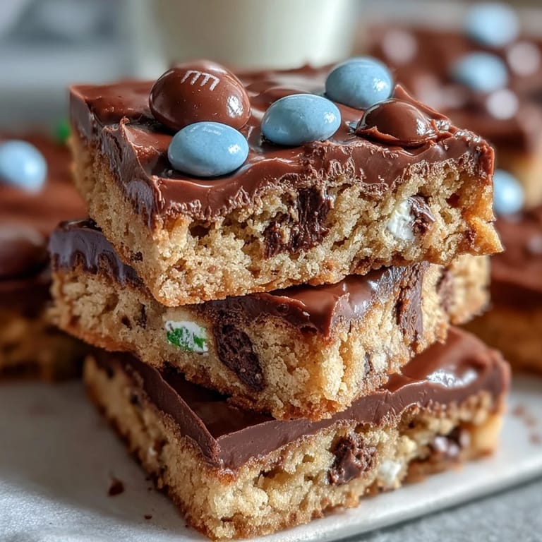 Save My neighbor Sarah showed up at my door one March afternoon with a box of Cadbury mini eggs she'd picked up early, grinning like she'd found treasure. She wanted to do something different with them beyond just eating them straight from the box, and honestly, I was skeptical—until we started folding those little chocolate gems into cookie dough and the kitchen filled with this warm, buttery, spring-like smell. These bars became our unexpected tradition that year, soft and chewy with pockets of chocolate that would melt on your tongue. Now every Easter season, someone asks me to make them.