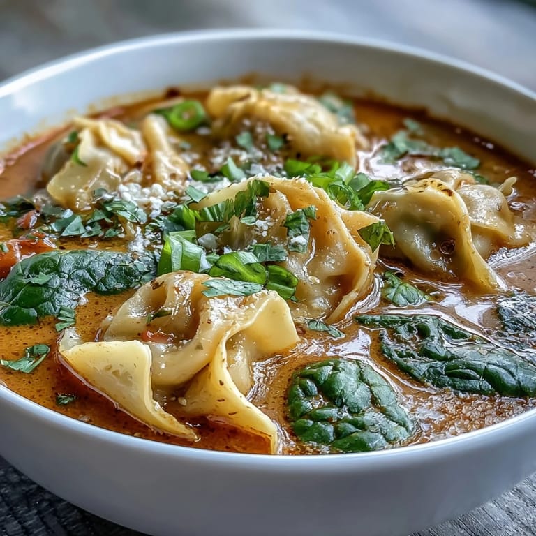 Save My kitchen filled with steam one weeknight when I decided to stop overthinking dinner and just throw together what I had on hand—frozen wontons, a jar of red curry paste, and a bunch of greens that needed rescuing from the back of my fridge. Twenty-five minutes later, my partner walked in to find me ladling this vibrant, aromatic soup into bowls, and I realized I'd accidentally created something that tastes far more impressive than the minimal effort it required. That's the magic of this red curry wonton soup: it feels like you're doing something fancy when you're really just combining a few bold flavors into something deeply satisfying.