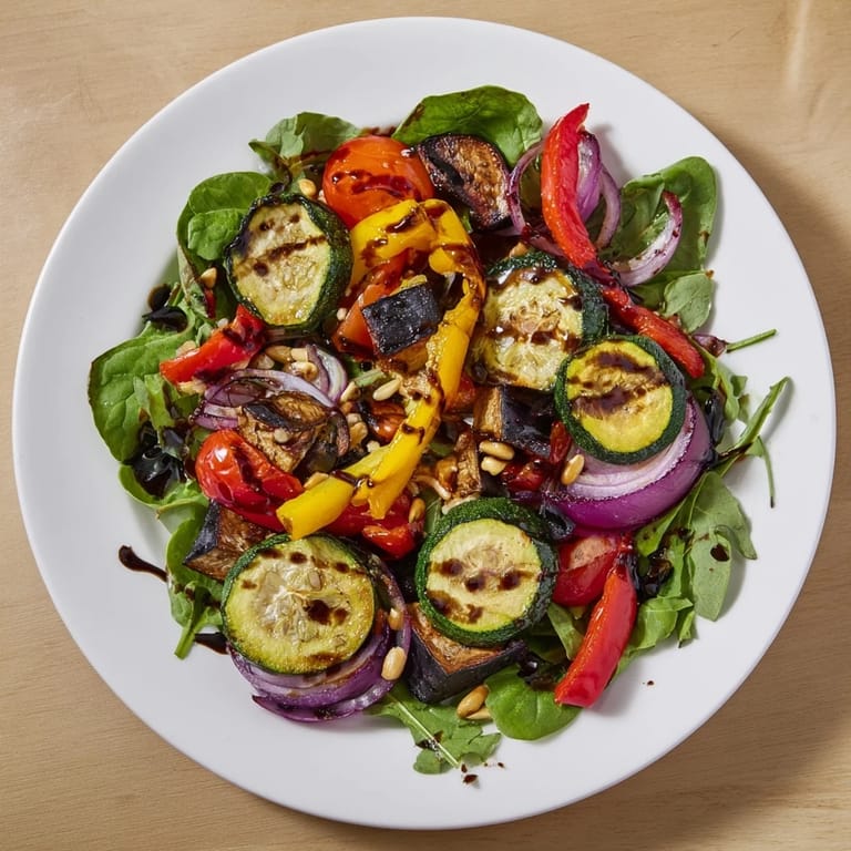 - Arrange your salad greens on a platter or individual plates, then top with the roasted vegetables while they're still warm—the heat slightly wilts the greens and makes everything taste connected. Drizzle generously with dressing, scatter pine nuts and cheese if using, and serve immediately before the vegetables cool too much.