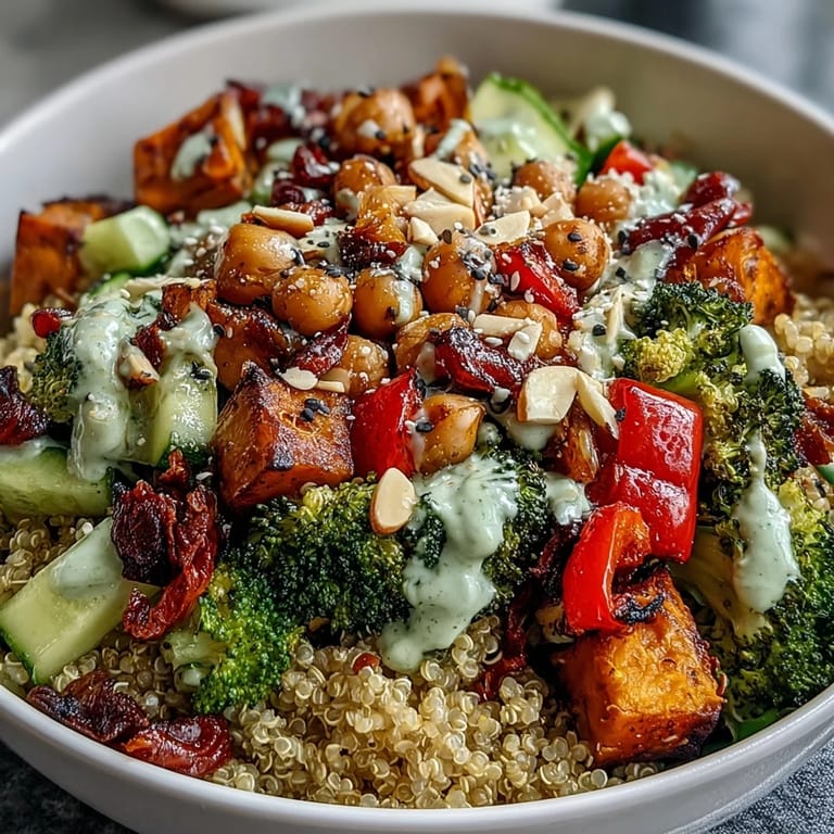 The beauty of this bowl is how adaptable it is to seasons and preferences. In summer, swap the roasted vegetables for raw zucchini ribbons and fresh corn, or lean into other greens like arugula or romaine. When fall arrives, roasted cauliflower or carrots work beautifully, and root vegetables like beets add gorgeous color and earthiness. Winter calls for heartier additions like roasted Brussels sprouts or butternut squash. If you want to add richness and don't mind dairy or animal products, crumbled feta cheese or thin avocado slices on top make this feel even more luxurious.