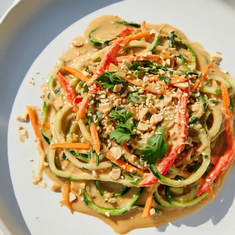 Save There's something about a spiralized vegetable that feels like instant celebration, even on the most ordinary Tuesday afternoon. I discovered this peanut zucchini noodle situation while standing in my kitchen with a brand new spiralizer, determined to figure out what I'd just bought, and honestly, the first thing I made was this—and it never left rotation. The combination of that tangy, creamy sauce coating tender zucchini strands with the snap of fresh carrots and peppers felt like someone had finally cracked the code on making vegetables feel like the main event instead of the supporting role. It's become the salad I make when friends stop by unexpectedly, or when I need something that tastes vibrant without spending an hour at the stove.